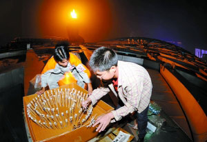 | 簡文:昨日凌晨3時(shí),在主火炬的照耀下,工人在鳥巢頂安放閉幕式煙花。本報(bào)記者 陳杰 攝