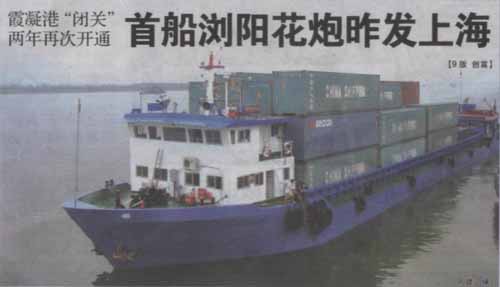 本報(bào)訊(記者林。┯浾咦蛉諒臑g陽方面獲悉,長沙市霞凝港將從8月25日起開運(yùn)煙花,上海港也將于9月2日恢復(fù)煙花運(yùn)輸業(yè).. 點(diǎn)擊:3156 |