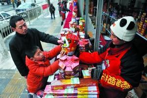 | 簡文:1石景山魯谷市場門前的煙花爆竹攤點內(nèi),一位母親帶著孩子在選購煙花爆竹。 本報記者胡雪柏攝