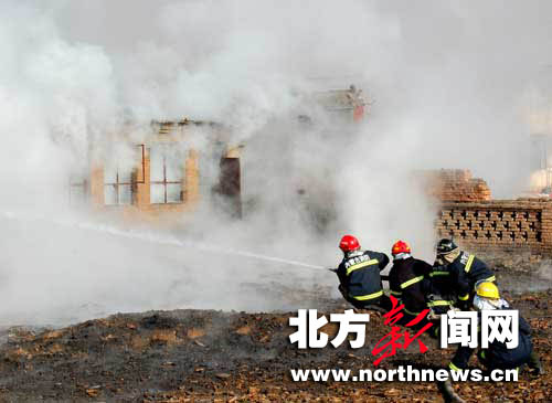 | 簡文:27日,呼和浩特市土左旗一花炮廠爆炸。圖為消防官兵正在奮力撲救春花花炮廠廠房的大火。
