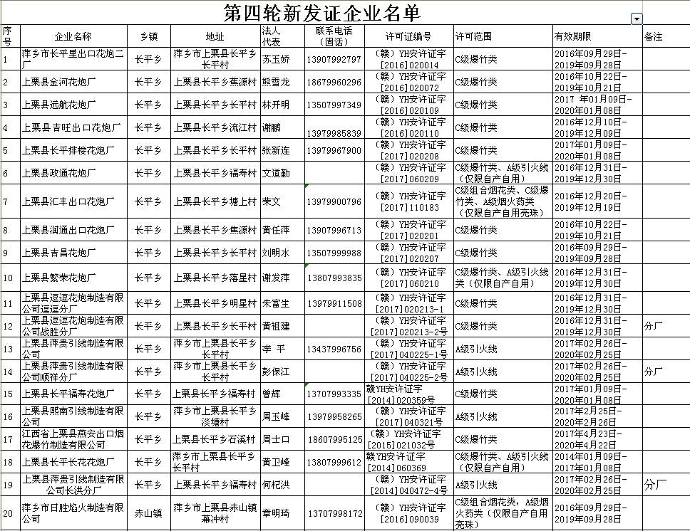 上栗縣花炮企業(yè)第四輪新發(fā)證企業(yè)名單 時(shí)間:2017年10月16日 |