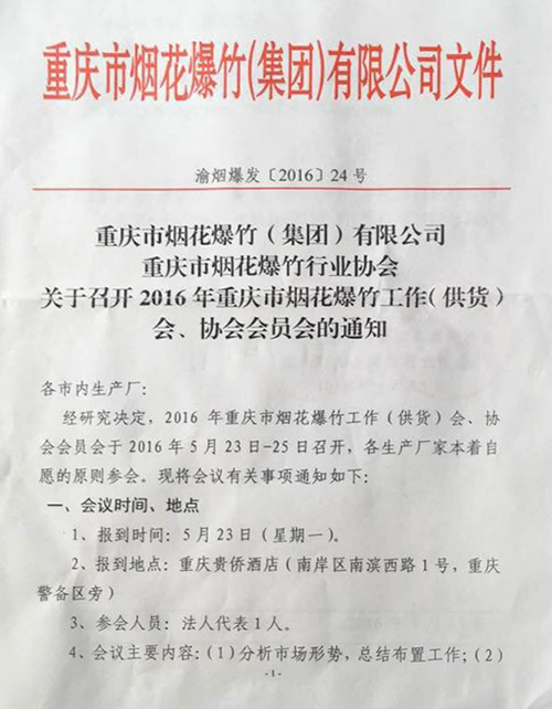 重慶市煙花爆竹行業(yè)協(xié)會 關(guān)于召開2016年重慶煙花爆竹工作(供貨)會、協(xié)會會員通知