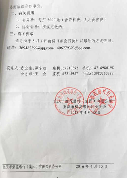 各市內(nèi)生產(chǎn)廠: 經(jīng)研究決定,2016年重慶市煙花爆竹工作(供貨)會、協(xié)會會員會于2016年5月23日一25日召開,各生產(chǎn)廠家本著自愿的原則參會.現(xiàn)將會議有關(guān)事項通知如下: 一、會議時間、地點 1、報到時問:5月23日(星期一)。 2、報到地點:重慶貴僑酒店(南岸區(qū)南濱西路1號,重慶警備區(qū)旁) 3、參會人員:法人代表1人。 4、會議主要內(nèi)容:(1)分析市場形勢,總結(jié)布置工作;(2)協(xié)商洽談合作事宜。 二、有關(guān)會費 1、會務(wù)費2000元(含資料費、2人食宿費)。 2、協(xié)會會費:按規(guī)定繳納 三、有關(guān)要求 請務(wù)必于5月4日前將《參會回執(zhí)》以郵件方式傳回 郵箱:369482399@qq.com、406779323@qq.com
