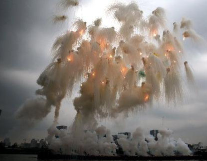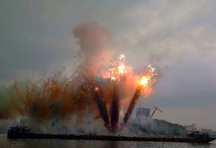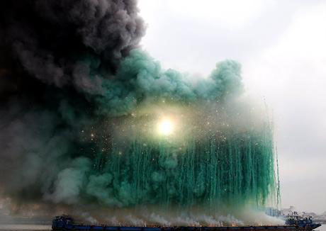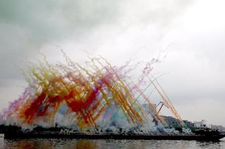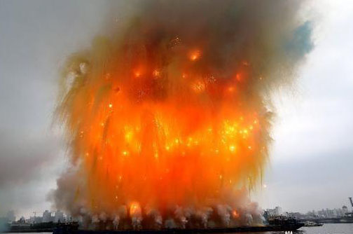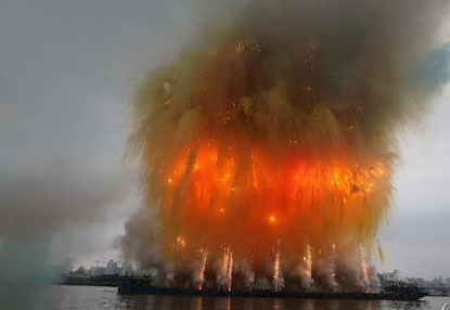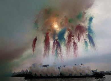 2014年8月8日,“蔡國強(qiáng):九級浪”展覽正式在上海當(dāng)代藝術(shù)博物館開幕,開幕式后,蔡國強(qiáng)在上海黃浦江面上,為上海市民獻(xiàn)上他在國內(nèi)的首件“白天焰火”作品。蔡國強(qiáng)在上海的作品白日焰火引發(fā)部分市民關(guān)注,上海市公安局8日下午在微博上表示:“蜀黍看見后也嚇了一跳!鄙虾>匠吻,據(jù)巡邏民警反饋,17時(shí)05分許,黃浦江上進(jìn)行了一場“白日煙彩”煙火創(chuàng)作表演,放了大約10分鐘,產(chǎn)生了大量煙霧。