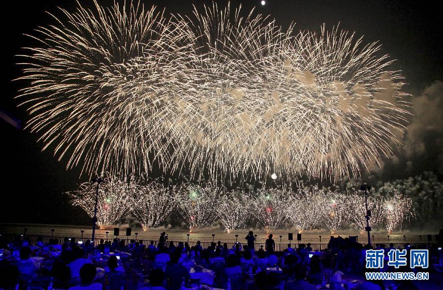 9月6日晚,2014上海金山國(guó)際沙灘煙花節(jié)在金山城市沙灘揭幕。煙花節(jié)期間,來(lái)自中國(guó)、墨西哥、意大利和美國(guó)的專題音樂(lè)煙花表演,將聯(lián)袂呈現(xiàn)煙花與音樂(lè)互動(dòng)交融的“海上聲光秀”,成為當(dāng)?shù)刂星锛压?jié)期間新美景。莊毅 攝