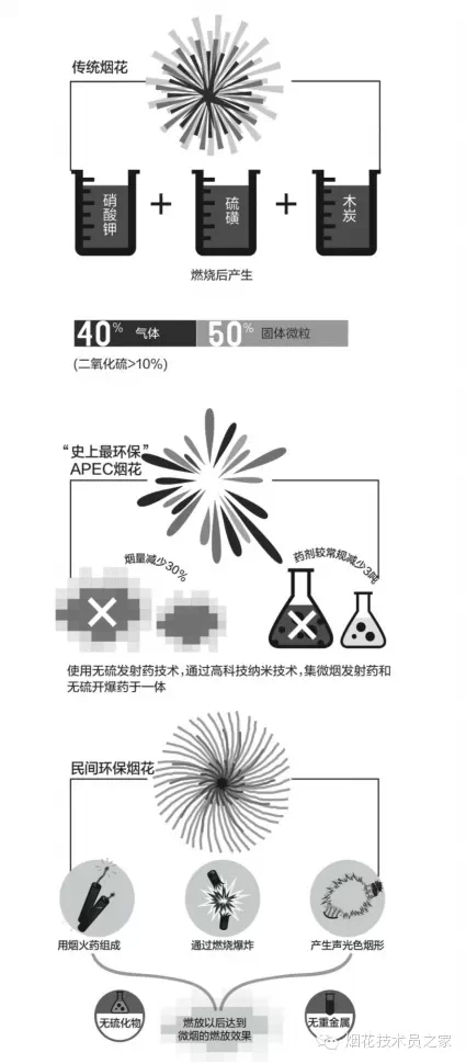 常規(guī)煙花中的黑火藥,包括一硝二磺三木炭,硝酸鉀是氧化劑,硫磺是含硫的化合物,木炭可供燃燒提供熱量。三元組合物質(zhì)沿用了1300多年,在灰霾日益加重的情況下,這個(gè)燃燒后會(huì)產(chǎn)生二氧化硫、重金屬顆粒等有害物質(zhì)的穩(wěn)定組合走到了末路。