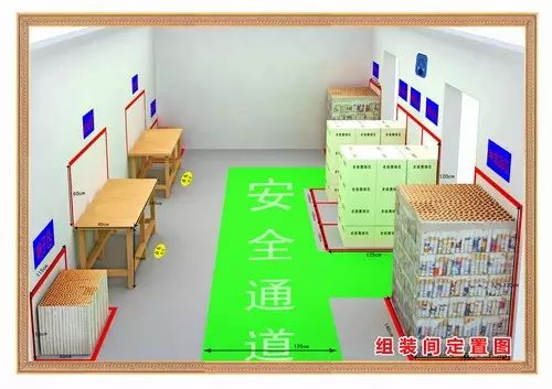 “定置管理”起源于日本,由日本青木能率(工業(yè)工程)研究所的艾明生產(chǎn)創(chuàng)導(dǎo)者青木龜男先生始創(chuàng)。定置管理也是“5S”活動(dòng)的一項(xiàng)基本內(nèi)容,是“5S”活動(dòng)的深入和發(fā)展!岸ㄖ霉芾怼笔且园踩、效率、方便為原則,科學(xué)地研究和分析生產(chǎn)現(xiàn)場(chǎng)中人、物、場(chǎng)所三者之間的關(guān)系,使之達(dá)到最佳結(jié)合狀態(tài)。具體做法是使用不同顏色標(biāo)志線確定現(xiàn)場(chǎng)(工房)人和物的位置、數(shù)量,也就是根據(jù)工房用途劃定作業(yè)區(qū)、工具區(qū)、成品區(qū)、半成品區(qū)、引線盒、紙箱區(qū)、材料輔助區(qū)、廢料區(qū)、安全通道等功能區(qū),也可提前利用三維立體圖對(duì)每類工房進(jìn)行設(shè)計(jì),再按照設(shè)計(jì)圖實(shí)施劃線。功能區(qū)的長(zhǎng)、寬、高要提前根據(jù)工房限定的總藥量再按單發(fā)或組為單位的個(gè)體含藥量進(jìn)行計(jì)算來確定成品區(qū)、半成品區(qū)、引線盒的大小,藥物線統(tǒng)一使用大小一致的盛裝煙火藥和黑火藥的鋁質(zhì)小桶和裝藥盒(目的是限定藥量)。