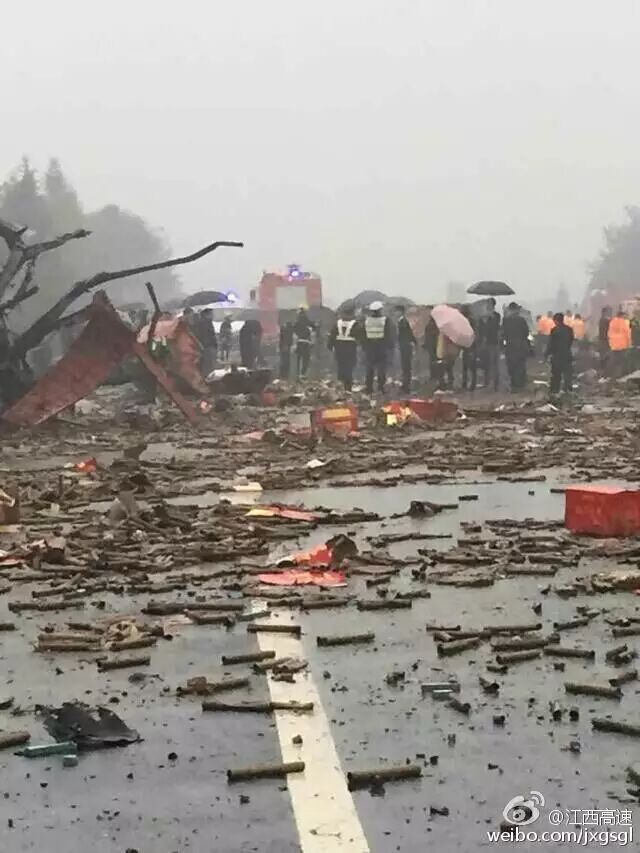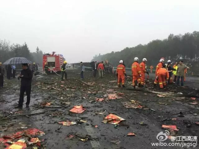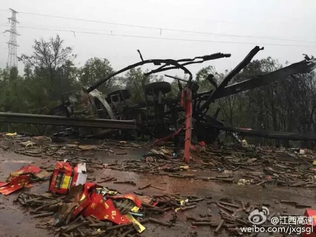 10月30日15點30分左右,滬昆高速江西境內(nèi)分宜到新余區(qū)間一油罐車與運輸爆竹車輛爆炸的事故。消防車輛已經(jīng)進入救援,路段已無法通行。附近房屋被震碎玻璃。傷亡情況還未知。 事故造成分宜收費站內(nèi)辦公樓和宿舍大面積玻璃碎裂。