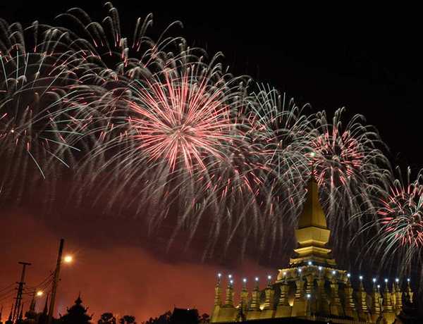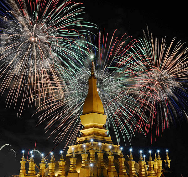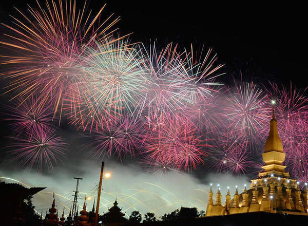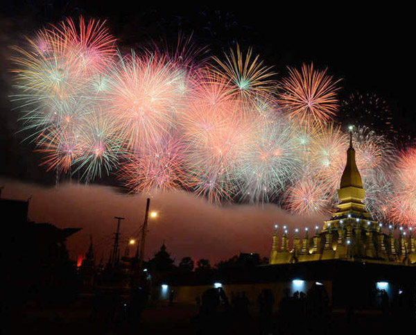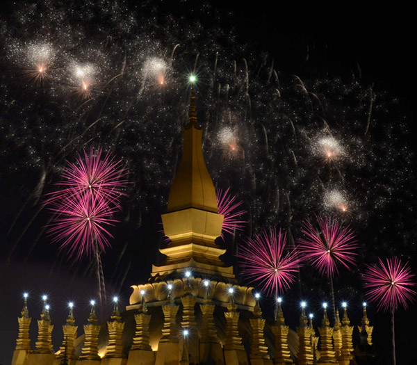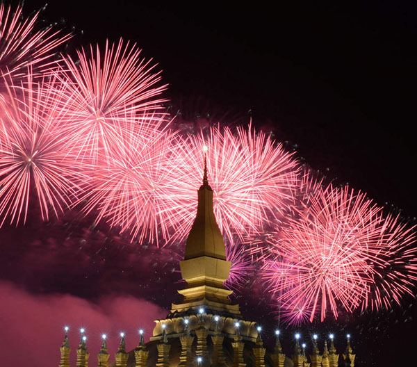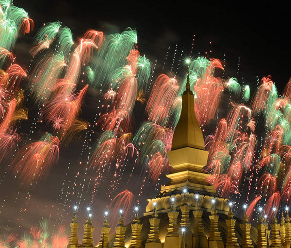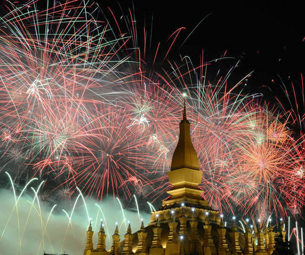 這是12月2日在老撾首都萬象塔鑾廣場拍攝的慶祝老撾建國40周年煙火表演。12月2日是老撾人民民主共和國成立40周年,當晚,由中國保利集團公司贊助的“多媒體音樂焰火燃放”在老撾著名的塔鑾廣場精彩上演,吸引了大批老撾高層官員及老撾民眾觀賞。燃放包括流星煙花、網(wǎng)幕焰火、空中造型特效、瀑布煙花、舞臺火焰、花束燭光等,特別是當老撾著名的地標塔鑾上方出現(xiàn)由煙花組合成的老撾國旗時,全場沸騰達到最高潮。新華社發(fā)(劉艾倫攝)