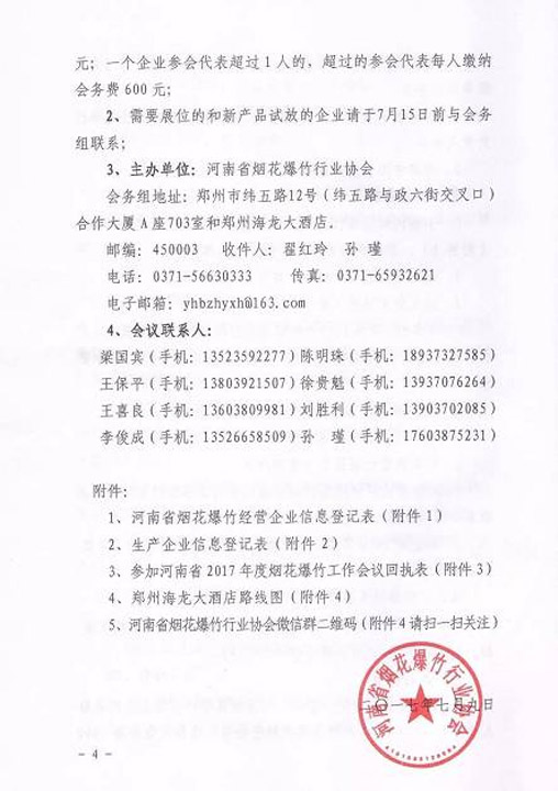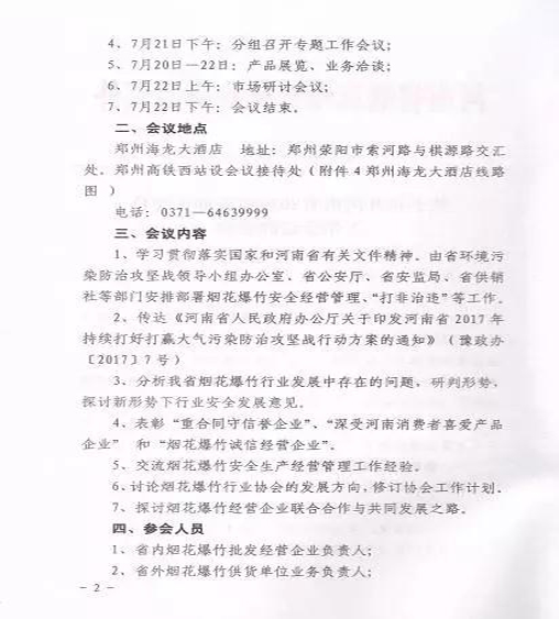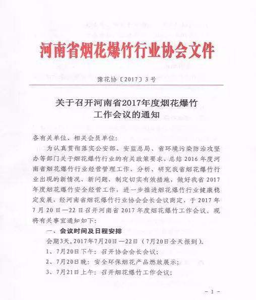 上一篇 ↑[2018年度黑龍江省煙花爆竹生產(chǎn)經(jīng)營(yíng)企業(yè)對(duì)接會(huì)議的通知] 下一篇 ↓[關(guān)于召開貴州省煙花爆竹流通協(xié)會(huì)三屆二次會(huì)議暨2017年度貴州省煙花爆竹產(chǎn)品訂貨會(huì)的通知]