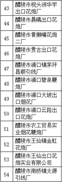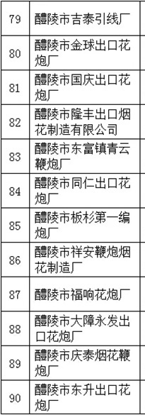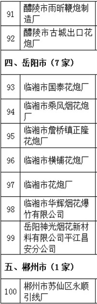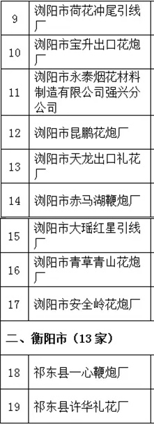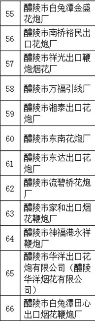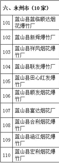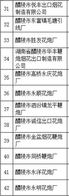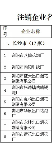 近日,湖南省安監(jiān)局依據(jù)《安全生產(chǎn)許可證條例》、《煙花爆竹生產(chǎn)企業(yè)安全生產(chǎn)許可證實(shí)施辦法》等規(guī)定,依法對(duì)瀏陽(yáng)市八仙花炮廠等110家煙花爆竹生產(chǎn)企業(yè)決定予以注銷,其生產(chǎn)活動(dòng)自然終止,現(xiàn)予公告。