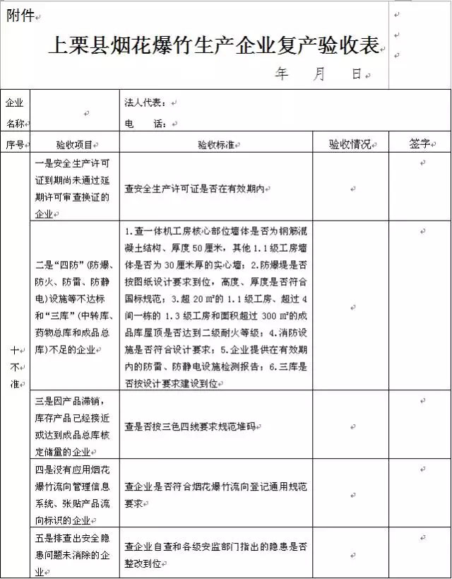 附件:上栗縣煙花爆竹企業(yè)復(fù)產(chǎn)工作驗(yàn)收表