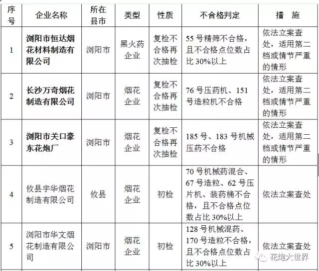 此次抽檢統(tǒng)計,有18家企業(yè)因重點涉藥機械設(shè)備接地不合格、被檢點位不合格率達30%以上或靜電設(shè)施、設(shè)備嚴(yán)重缺失等,被認(rèn)定導(dǎo)靜電設(shè)施安全抽檢不合格單位(具體名單見附件2)。其中,瀏陽市恒達煙花材料制造有限公司、長沙萬奇煙花制造有限公司、瀏陽市關(guān)口豪東花炮廠等3家企業(yè)2016年度被國家安全監(jiān)管總局、省安監(jiān)局抽檢不合格,此次復(fù)檢仍不合格。