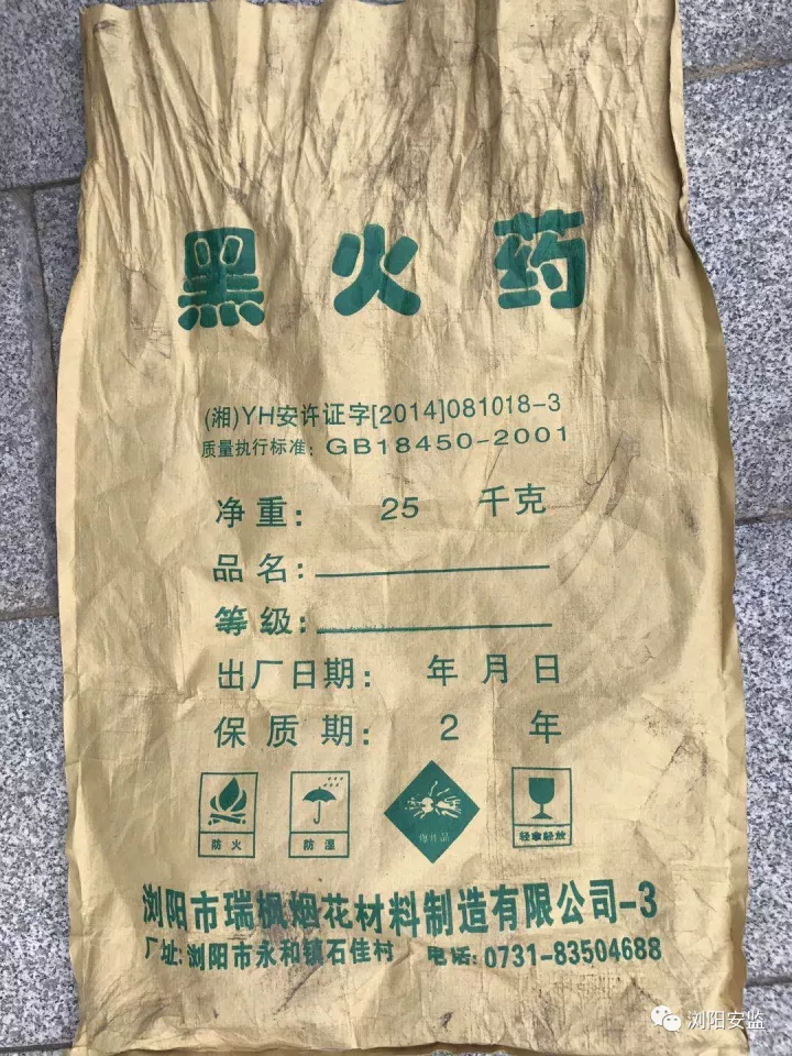 事情源于9月14日,瀏陽市富太花炮廠通過瀏陽市公安局的批準從瑞楓煙花材料制造有限公司金源分公司購進40袋黑火藥,該批黑火藥的外包裝為牛皮紙袋,不符合《煙花爆竹 黑火藥和引火線包裝技術要求》標準包裝要求。