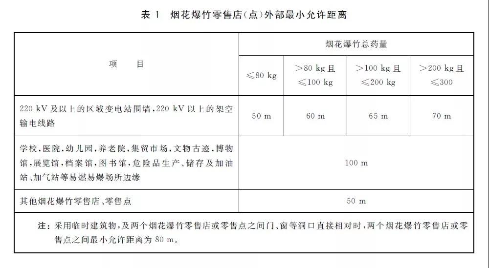 煙花爆竹零售店、零售點外部最小允許距離應(yīng)符合表1的規(guī)定,還應(yīng)符合GB50016等有關(guān)國家標(biāo)準(zhǔn)規(guī)定,外部最小允許距離自煙花爆竹零售場所外墻或與其他場所隔墻外側(cè)算起;專柜銷售的自煙花爆竹零售場所與其他場所之間隔斷外側(cè)算起。