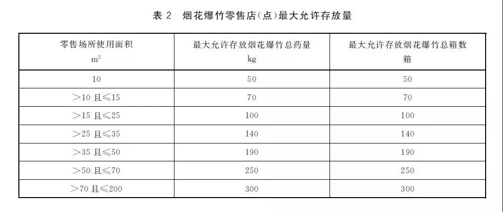 標(biāo)準(zhǔn)規(guī)定,煙花爆竹零售店、零售點的使用面積不應(yīng)小于10平方米,且不應(yīng)大于200平方米;專柜銷售煙花爆竹的商店,總建筑面積不應(yīng)大于300平方米。允許存放煙花爆竹的總藥量:專店不應(yīng)超過300kg,專柜不應(yīng)超過100kg;允許存放煙花爆竹總箱數(shù):專店不應(yīng)超過300箱,專柜不應(yīng)超過100箱;且應(yīng)同時符合表2規(guī)定: