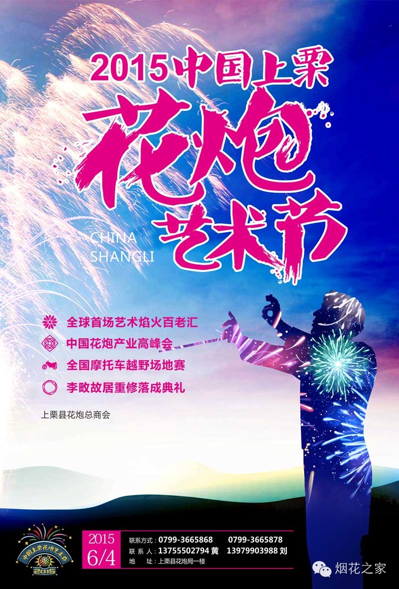 2015上栗花炮,將聚焦全球目光。由上栗縣花炮總商會主辦的中國上栗花炮藝術(shù)節(jié)將拉開帷幕。本次節(jié)會主題為“花炮之源,讓世界看見”,節(jié)會以花炮祖師李畋壽誕(6月4日)為契機(jī),打造上栗花炮產(chǎn)業(yè)2015年度盛會。本次節(jié)會立足于服務(wù)本地經(jīng)濟(jì)文化的發(fā)展和上栗花炮整體品牌的提升,主體活動包括全球首場藝術(shù)焰火百老匯、中國花炮產(chǎn)業(yè)高峰會、全國摩托車越野場地賽、李畋故居重修落成典禮等活動。
