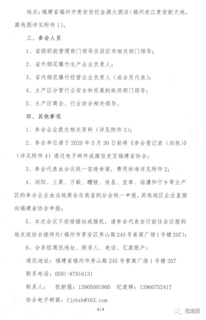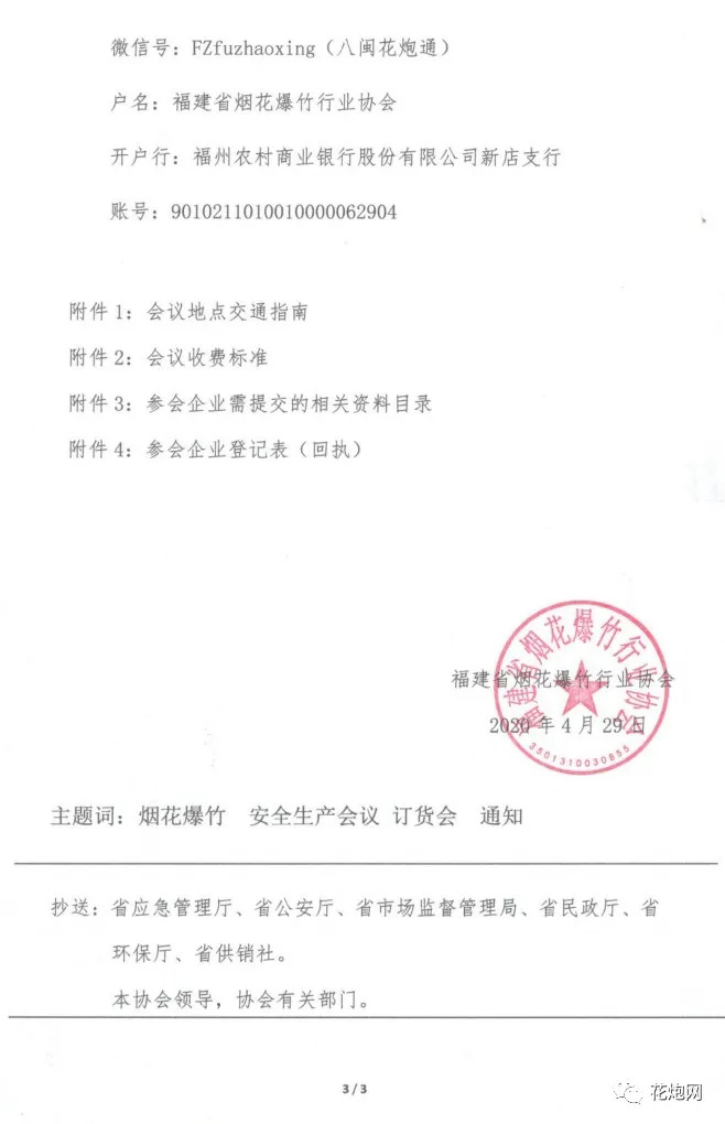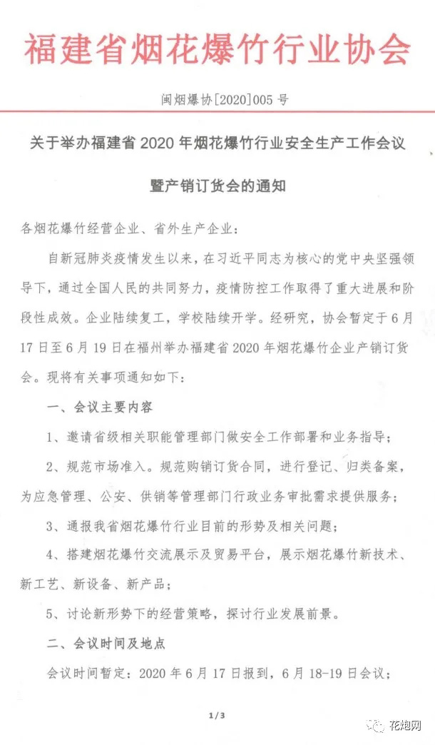 上一篇 ↑[關(guān)于召開(kāi)四川省煙花爆竹協(xié)會(huì)第二屆二次會(huì)員大會(huì) 暨四川省2020年煙花爆竹行業(yè)交流會(huì)的通知] 下一篇 ↓[關(guān)于舉辦福建省 2019 年煙花爆竹企業(yè)產(chǎn)銷訂貨會(huì)的通知]