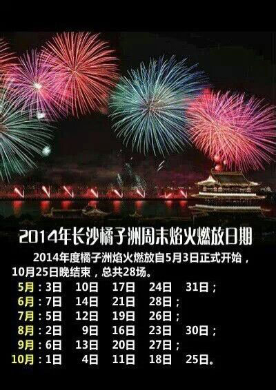 9月27日晚20:30,长沙橘子洲周末音乐焰火将燃放主题音乐焰火《奔向蓝天》。燃放单位为浏阳市国泰出口花炮厂。..