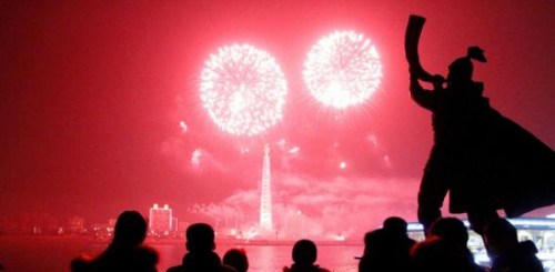 2014年1月1日,朝鲜平壤,大同江上空烟花盛放,庆祝新年到来。..
